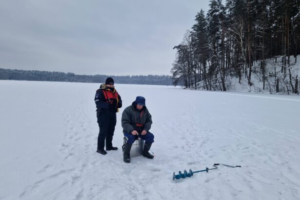 Varėnos policijos komisariato bendruomenės pareigūnė ir Varėnos priešgaisrinės gelbėjimo tarnybos specialistė tikrino, ar saugiai ant ledo žvejoja žvejai
