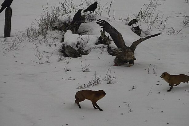Pasieniečiai užfiksavo įdomius vaizdus – prie fizinio barjero puotavęs erelis grobiu su lapėmis nesidalijo