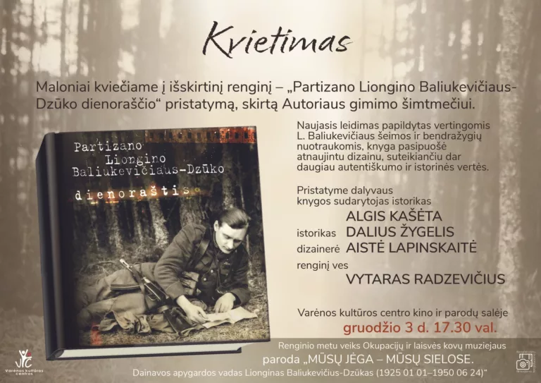 Gruodžio 3 d. 17.30 val. Varėnos kultūros centro kino ir parodų salėje vyks atnaujinto „Partizano Liongino Baliukevičiaus–Dzūko dienoraščio“ leidimo pristatymas, skirtas autoriaus gimimo šimtmečiui.