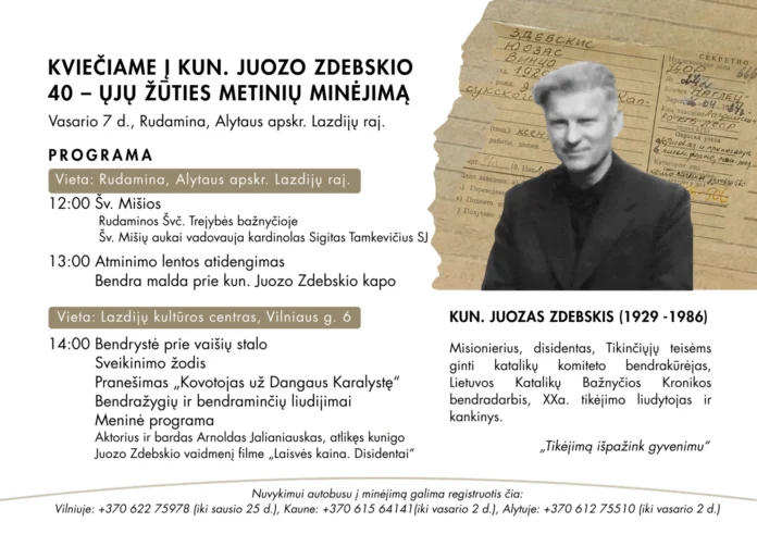 Vasario 7 dieną bus minimos iškilaus kunigo, misionieriaus, disidento, Tikinčiųjų teisėms ginti katalikų komiteto vieno iš įkūrėjų, Lietuvos Katalikų Bažnyčios Kronikos bendradarbio Juozo Zdebskio 40-osios žūties metinės. Kunigo gyvenimas buvo tarsi nuolatinė malda – ne tik žodžiais, bet ir darbais. Juose atsispindėjo begalinė meilė Dievui ir Dzūkijos žmonėms.