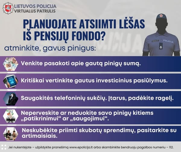 Lietuvos policijos priminimas tiems, kurie planuoja atsiimti lėšas iš pensijų fondo. Gyventojai raginami būti apdairiais ir saugotis sukčių.