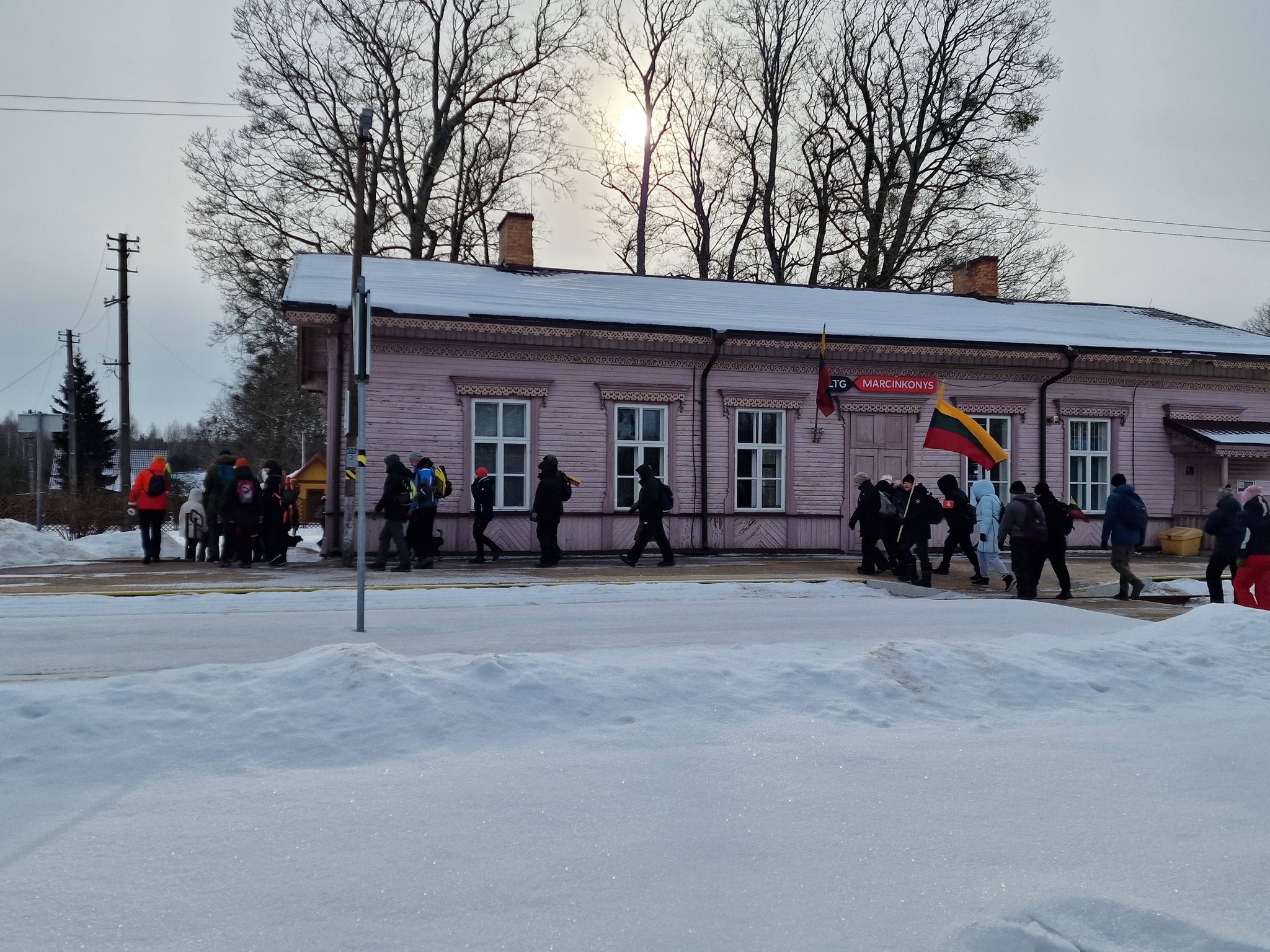 Žygis prasidėjo istorinėje kaimo vietoje prasmingu akcentu. Prie Marcinkonių geležinkelio stoties esančio kryžiaus tremtiniams ir politiniams kaliniams atminti žygeiviai sugiedojo Tautišką giesmę ir nešini trispalvėmis, pasipuošę tautine atributika, leidosi į žygį. Jo vadovu ir gidu buvo Marcinkonių bendruomenės narys Jonas Bajoriūnas, kiekvienoje sustojimo vietoje papasakojęs įdomių su ta vieta susijusių istorijų. Keliautojai trumpam sustojo prie Kastinio ežero esančio Baltų mitologijos skulptūrų parko. Eidami šalia geležinkelio, išgirdo įdomių istorijų apie senąjį Sankt Peterburgo-Varšuvos geležinkelį, kuris pro Marcinkonis buvo nutiestas 1860 m.