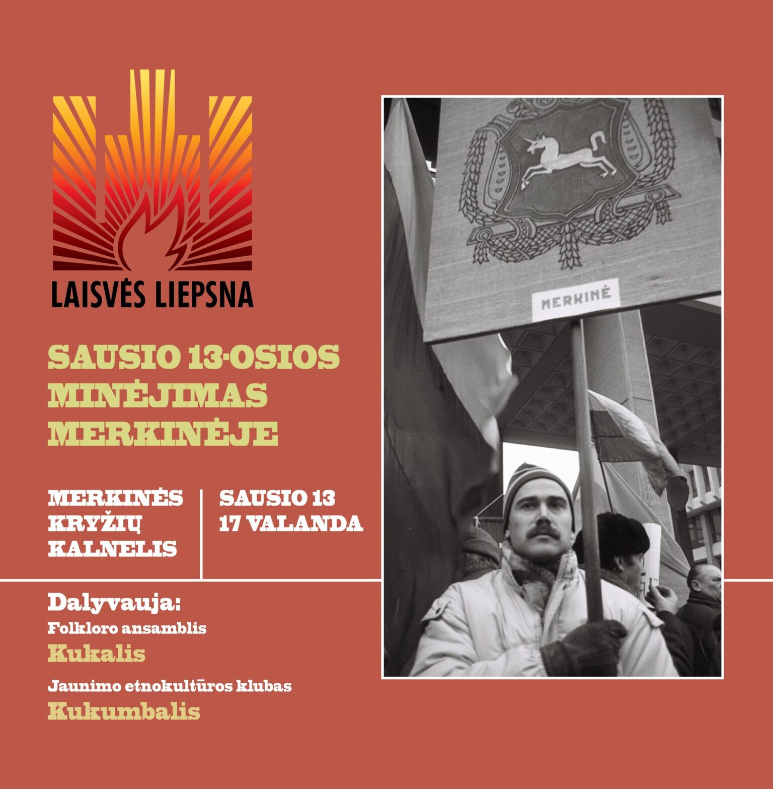 Sausio 13 d. 17 val. Merkinės kultūros centras ir Merkinės krašto muziejus visus kviečia į Kryžių kalnelį. Čia 35 kartą bus paminėti 1991 m. sausio įvykiai, kai sovietų sąjunga, pasiremdama armija ir kitomis jėgos struktūromis, mėgino nuversti teisėtai išrinktą Lietuvos valdžią ir neteisėtai sugrąžinti Lietuvą į sovietų sąjungos sudėtį. Šimtai tūkstančių beginklių Lietuvos žmonių sugebėjo sustabdyti šį agresijos aktą.