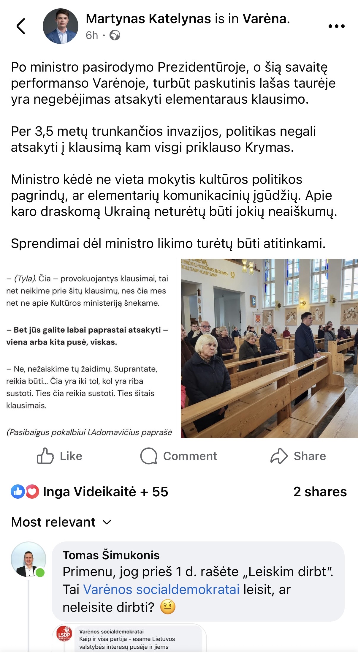 Apie tai savo socialiniame tinkle pasisakė Seimo narys, socialdemokratas Martynas Katelynas. Jis pasidalijo nuotrauka, kurioje matyti Varėnos bažnyčioje buvęs ministras, ir parašė: