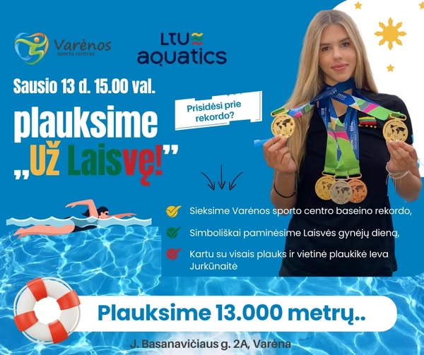 Varėnos sporto centras sausio 13 d. 15.00 val. kviečia visus į baseiną prasmingai ir vieningai paminėti Laisvės gynėjų dieną. Šia proga visi dalyviai drauge plauks simbolinius 13 000 metrų, pagerbdami Laisvės gynėjus ir siekdami Varėnos baseino rekordo. Kiekvienas metras – tai mūsų vienybės, atminimo ir pagarbos ženklas.
