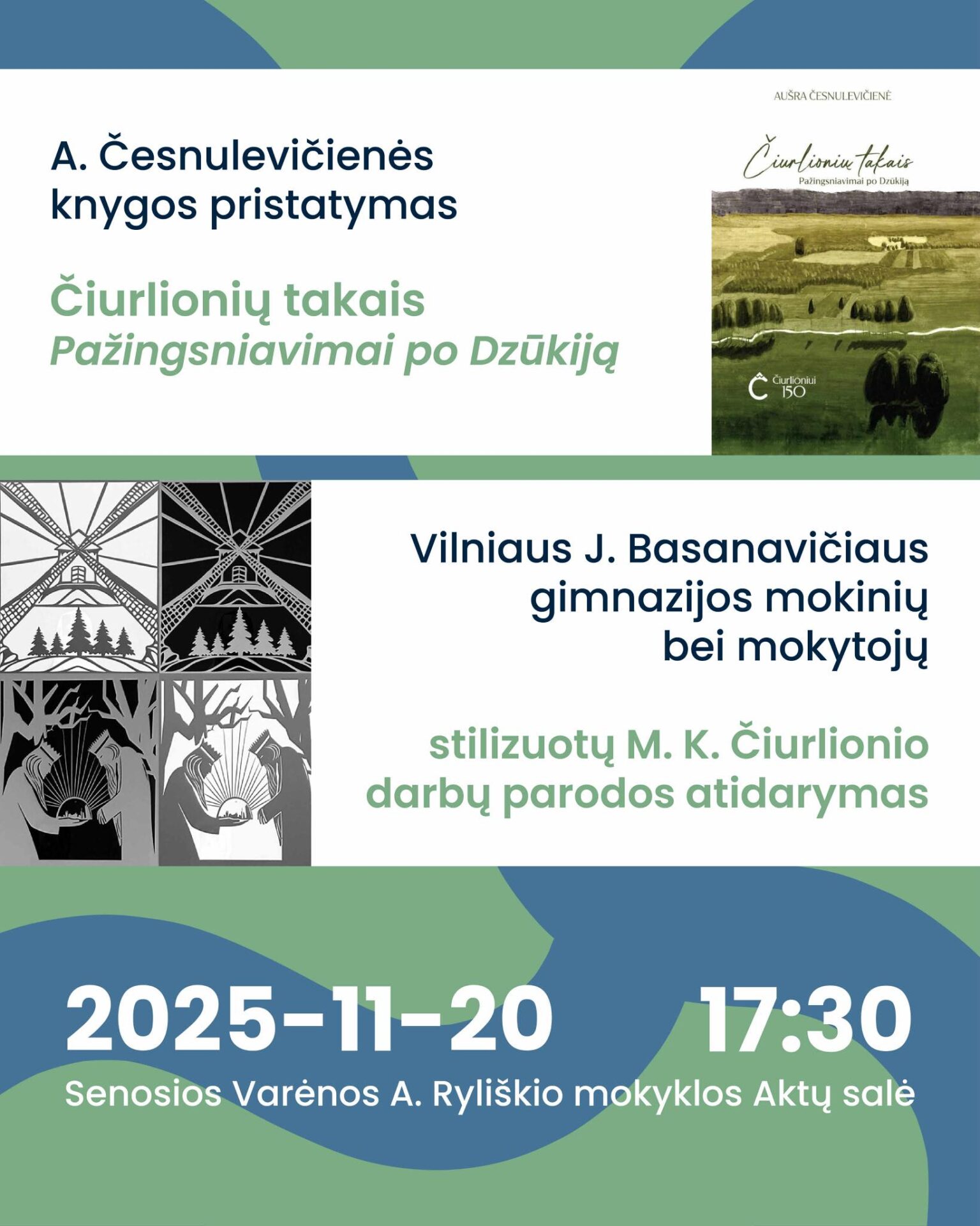 Jau šį ketvirtadienį, lapkričio 20 d. 17.30 val., M. K. Čiurlionio gimtinėje Senojoje Varėnoje žymusis kraštietis bus pagerbtas gražiu renginiu. Senosios Varėnos A. Ryliškio mokykloje druskininkietė menotyrininkė Aušra Romanovaitė pristatys savo knygą „Čiurlionių takais. Pažingsniavimai po Dzūkiją“. Čia bus atidaryta Vilniaus Jono Basanavičiaus mokinių ir mokytojų stilizuotų M. K. Čiurlionio darbų (karpinių) paroda.