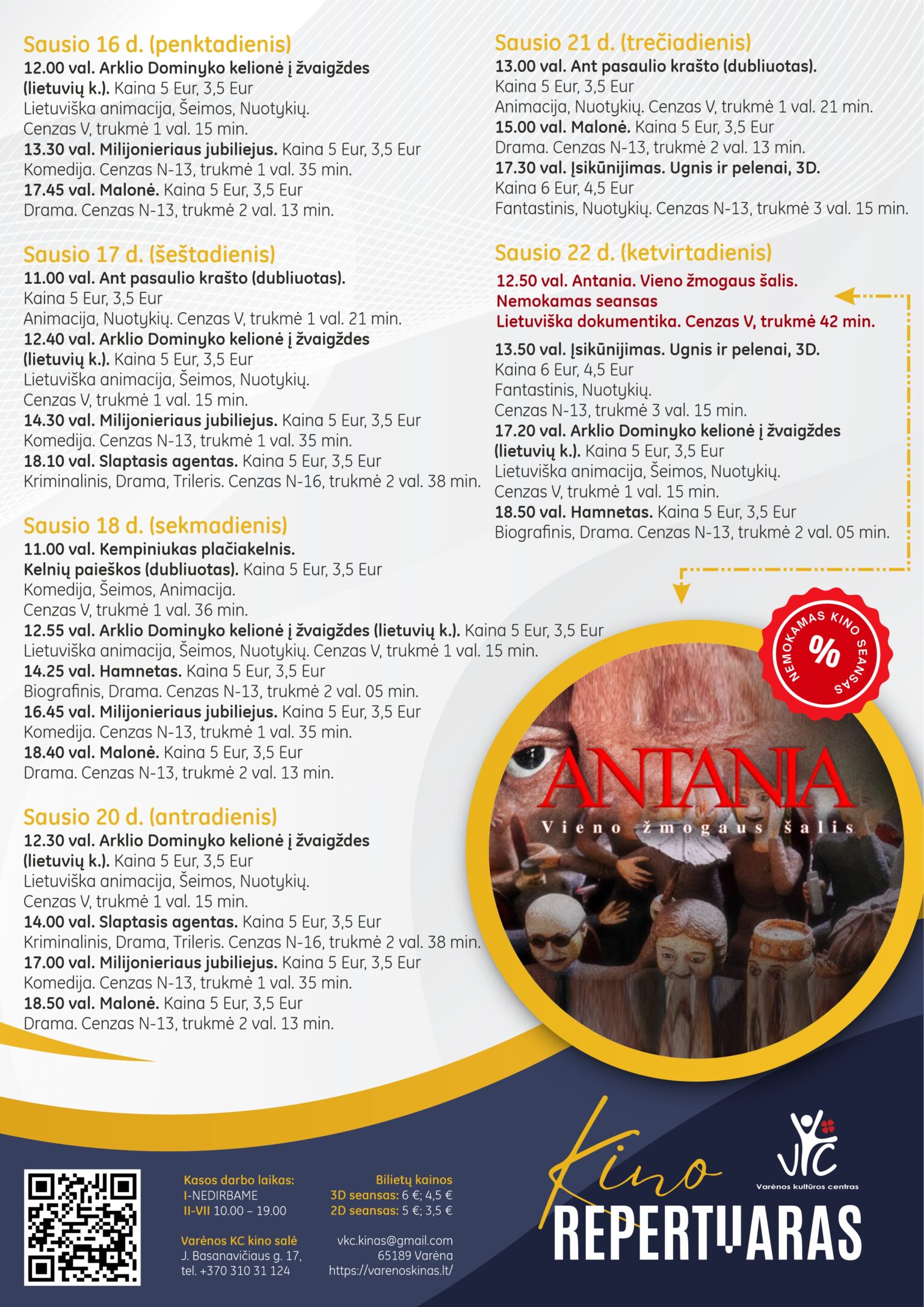 Gyvenimas Varėnos kino salės filmų repertuaras Autorius: Varėnos kultūros centro informacija Publikuota: 2026 19 sausio Komentarų: 0 Dalintis Skelbiame sausio 16-22 d. Varėnos kino salės filmų repertuarą. ŽYMOS:filmaiVarėnos kino salė Komentarų: 0 Parašykite komentarą Atšaukti atsakymąEl. pašto adresas nebus skelbiamas. Būtini laukeliai pažymėti *Komentaras * Vardas El. pašto adresas Interneto puslapis Naujienos iš interneto Reklama