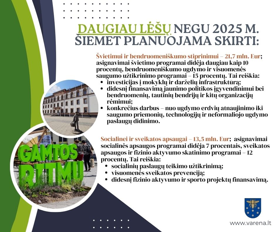 asignavimai švietimo programai didėja daugiau kaip 10 procentų, bendruomeniškumo ugdymo ir visuomenės saugumo užtikrinimo programai – 15 procentų. Tai reiškia: