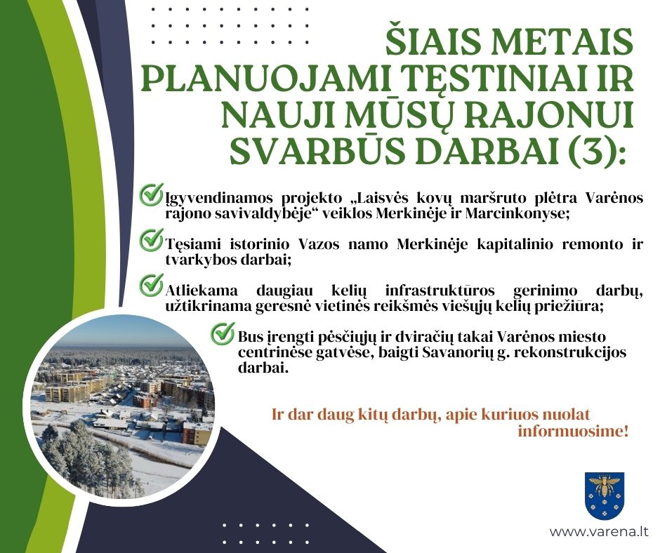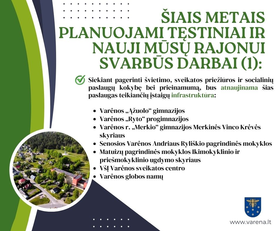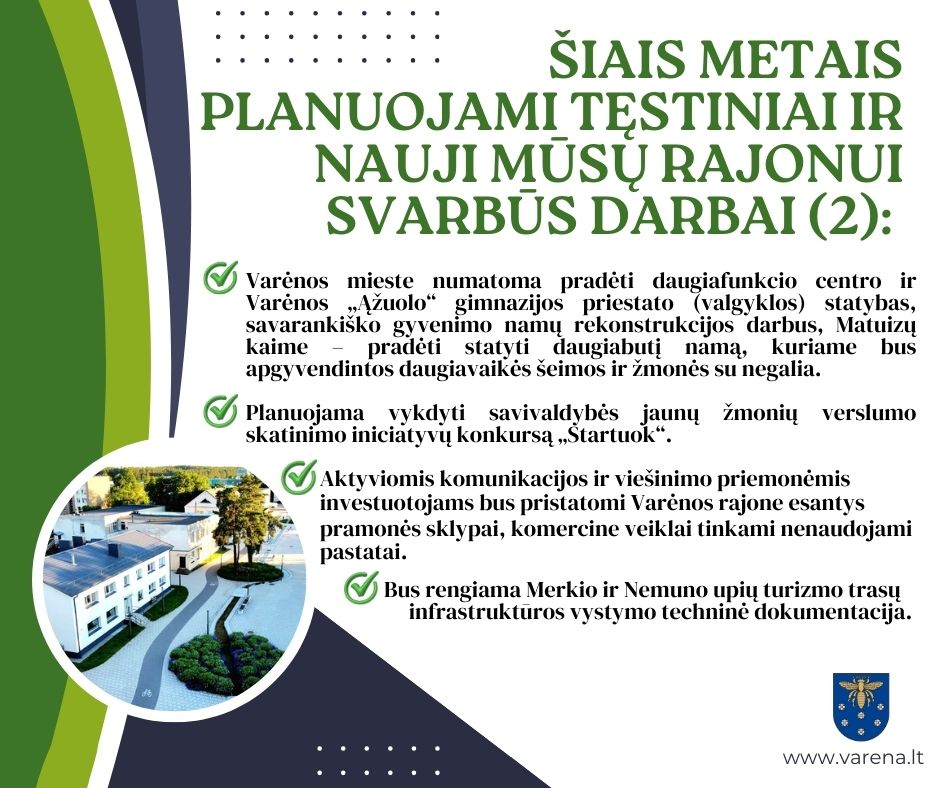 Varėnos mieste numatoma pradėti daugiafunkcio centro ir Varėnos „Ąžuolo“ gimnazijos priestato (valgyklos) statybas, savarankiško gyvenimo namų rekonstrukcijos darbus, Matuizų kaime – pradėti statyti daugiabutį namą, kuriame bus apgyvendintos daugiavaikės šeimos ir žmonės su negalia;