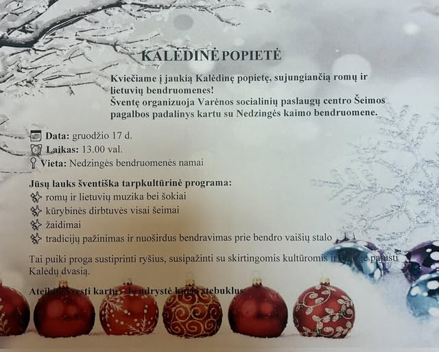 Šį trečiadienį, gruodžio 17 d. 13 val., Nedzingės bndruomenės namuose Varėnos socialinių paslaugų centras ir Nedzingės kaimo bendruomenė organizuoja kalėdinę popietę, kurioje dalyvaus lietuvių ir romų bendruomenės atstovai. Žiūrovų laukia įdomi tarpkultūrinė programa ir proga pažinti romų kultūrą.