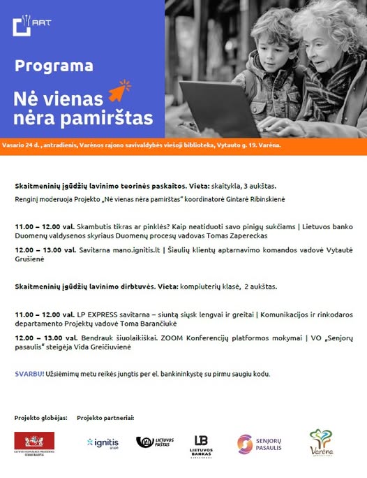 Rytoj, vasario 24 d. 11 val., Varėnos viešojoje bibliotekoje vyks projekto „Nė vienas nėra pamirštas“ mokymai. Jų metu bus galima išmokti ir sužinoti nemažai naudingų dalykų. Ar žinojote, kad šiandien sukčiai jau kalba ne tik rusiškai? Jie kalba ir lietuviškai, mandagiai, įtikinamai. Ir kartais net „banko atstovo“ balsu! Išmoksite atpažinti pavojų dar prieš ištariant „gerai, padiktuosiu kodą…“. Taip pat praktiškai sužinosite, kaip naudotis „Ignitis“ savitarna: sudaryti elektros ir dujų tiekimo sutartis, deklaruoti skaitiklių rodmenis, patogiai ir saugiai atsiskaityti už elektrą ir dujas.