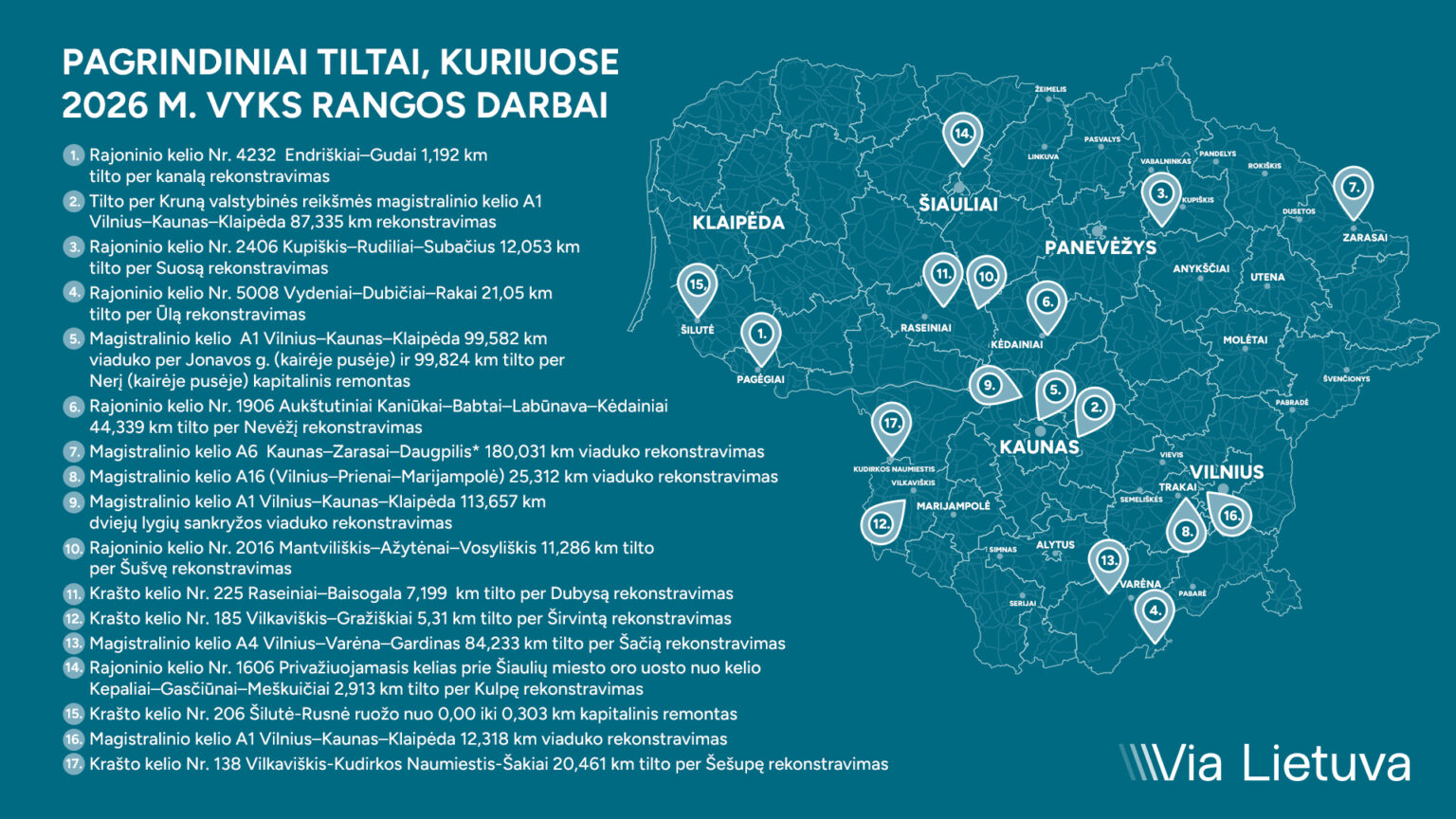 ,,Planuojama, kad didžiosios daugumos visų numatytų rekonstruoti tiltų darbai bus baigti ir eismas paleistas iki 2026 metų pabaigos, taip stipriai prisidedant prie eismo saugumo ir patikimos kelių infrastruktūros užtikrinimo“, – pabrėžia „Via Lietuva“ vadovas Martynas Gedaminskas.
